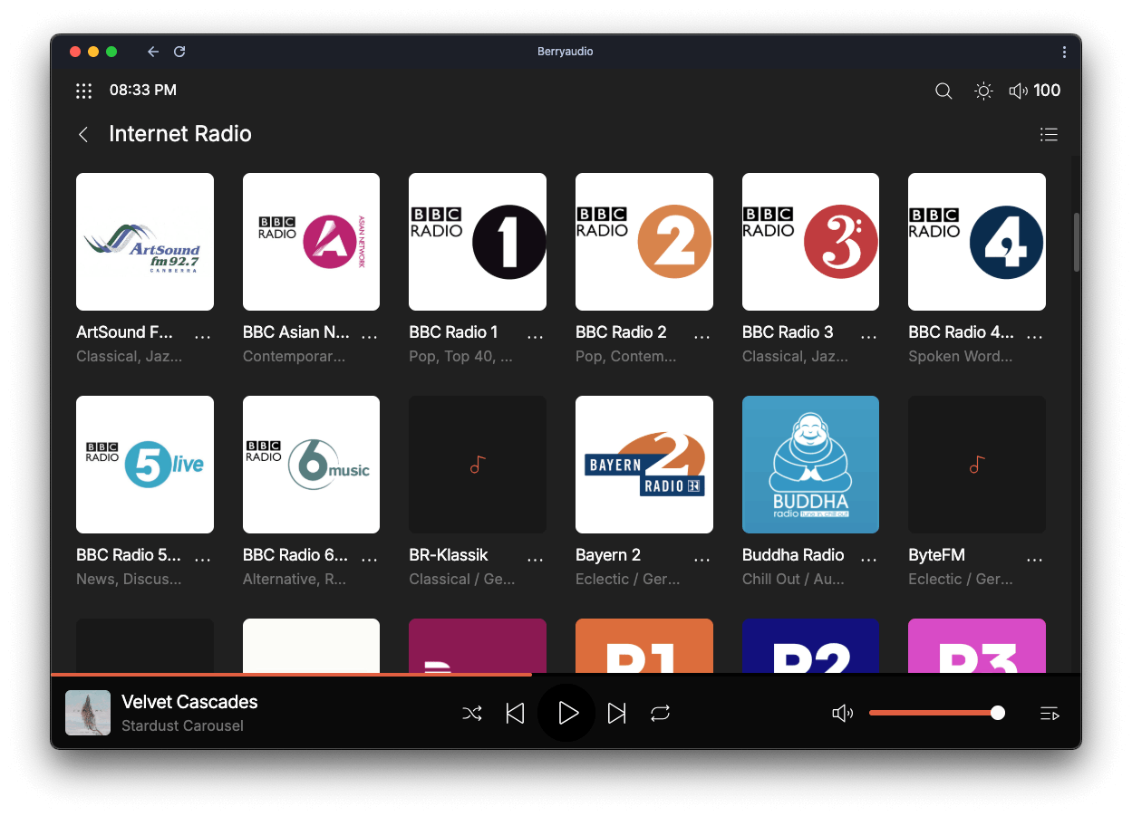 200+ curated internet stations — BBC, Flux FM, SomaFM and more