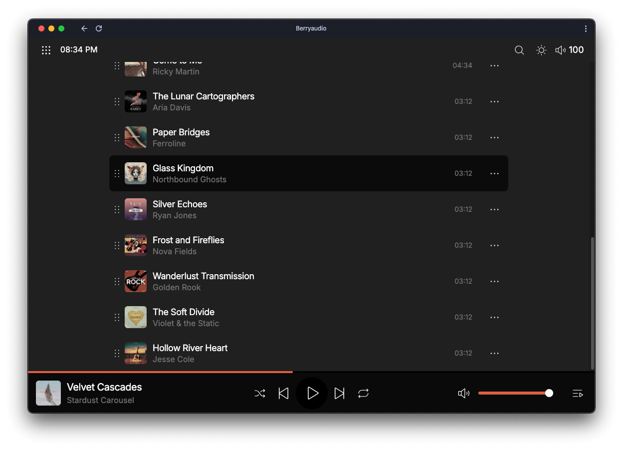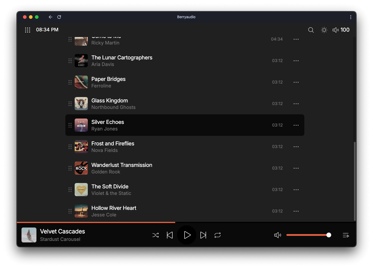 Drag & drop playlists, repeat, shuffle, persistent queue